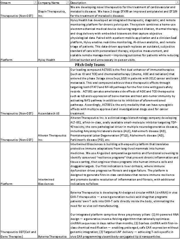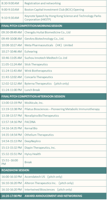 | · Harvard Life Lab · Harvard Innovation Labs · Harvard Wyss Institute · Harvard Medical School CSSA · Ohio State University College of Pharmacy Innovation Center · Pittsburg University Healthcare Incubator · Stanford University Healthcare Innovation Lab – Stanford Pipeline · Nest.Bio · Netherlands Innovation Center (NIC) · Frees Fund · JJLake Asia Future Innovation Challenger · Dane Capital · Aquillius · Simcere Therapeutical · Blue Ocean Capital Group · Chinese Entrepreneurs Organization at Duke (DukeCEO) · Penn Quakers Venture Club- Fish & Richardson· InnoStar · Porton · 闻药事 | · Yale Venture Club · The Hopkins Club for Innovation and Entrepreneurship · Asia America Innovation Alliance (AAIA) · GeneOnline · Life-Science Entrepreneurship and Plus (LEAP) · Huazhong University of Science and Technology (HUST) Boston Alumni Association · Tongji Medical College of HUST Boston Chapter · YuanBio Venture Capital · AAEA · PagodaTree Partners · AbbVie Ventures · F Prime · Amgen Venture · TOP Innovation Districts Lab · Greenberg Traurig · Baker Mckenzie · The Chinese Antibody Society (CAS) – Berkley QB3- Startup Boston· 博药 · 前途汇· Biolink | · VIVA · Medicilon · ATLATL · Xingu Chuangfu · Alliance of Venture and Entrepreneurs Organization for Chinese Students Alumni at Harvard · Slush China · Danen Capital · Association d’Incubateur Franco-Chinois (AIFC) · Brandeis Impact · Chinese Entrepreneurs Organization · CuBio Innovation Center · HiMed · HuaSu Future · Eisai Innovation Inc · Regent Advisors · Enterprise Singapore · Massachusetts Biomedical Initiatives (MBI) · K2 Venture Partners· Singapore Economic Development Board (EDB)· Saudi Aribia NEOM Biotech Investment· P4 Precision Medicine Accelerator(UK) |